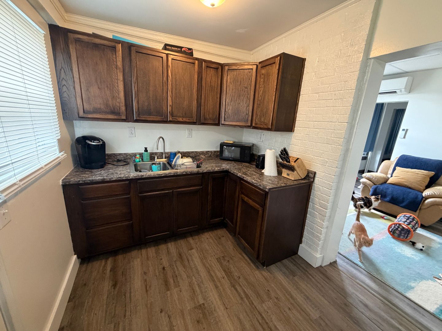 1-bedroom unit featuring an open kitchen and a comfortable living area with space for a home office. Shared laundry and on-site parking included. Water, sewer, gas, and electric are all included in the rent. Pets welcome.